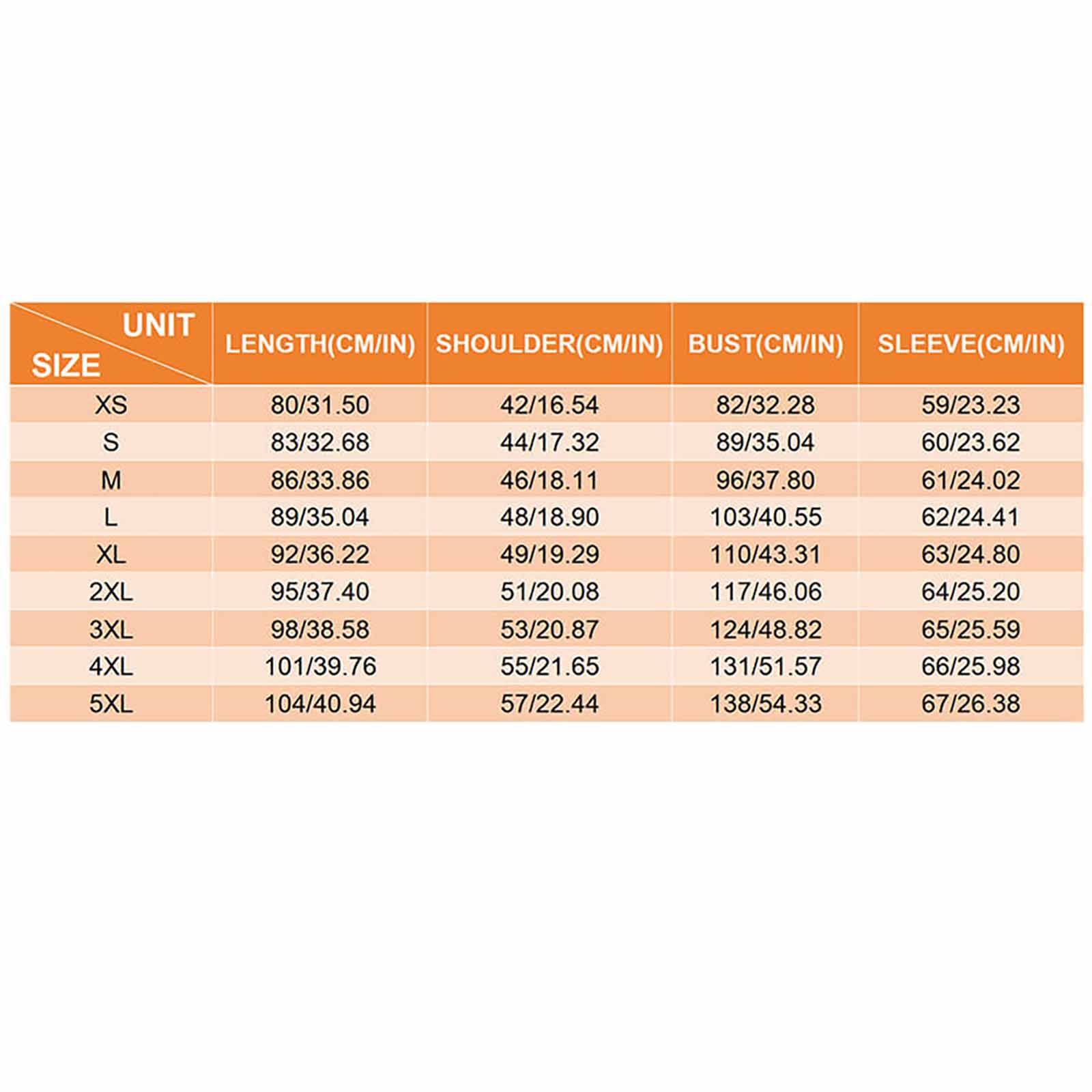 Size | Length (cm/in) | Shoulder (cm/in) | Chest (cm/in) | Sleeve Length (cm/in) |