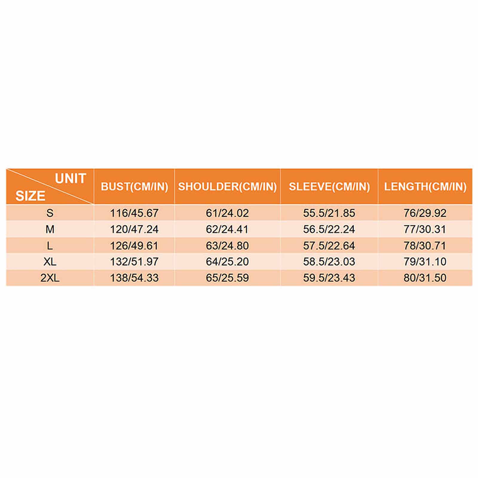 Size | Chest (cm/in) | Shoulder (cm/in) | Sleeve (cm/in) | Length (cm/in) |