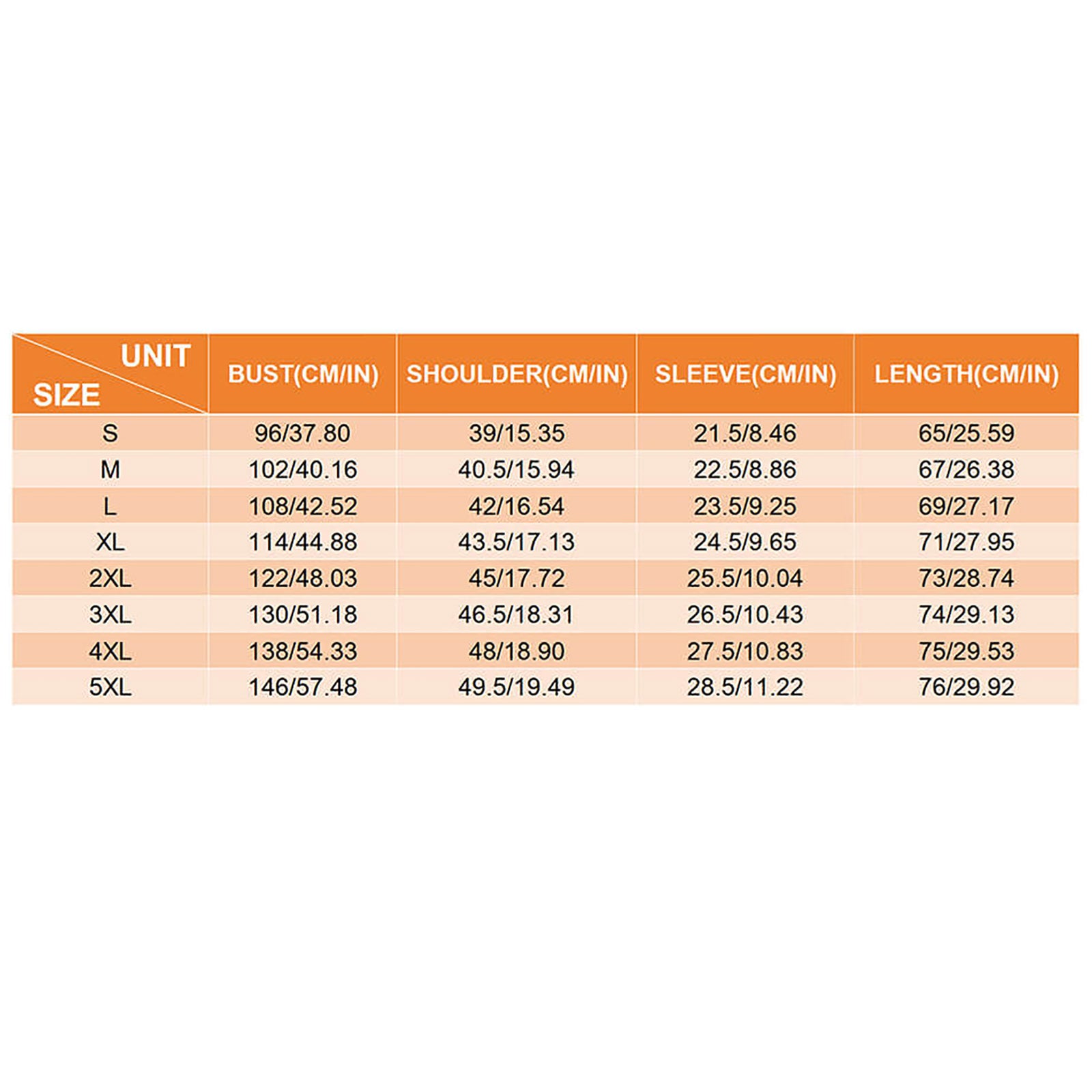 Size | Bust (cm/in) | Shoulder (cm/in) | Sleeve Length (cm/in) | Length (cm/in) |