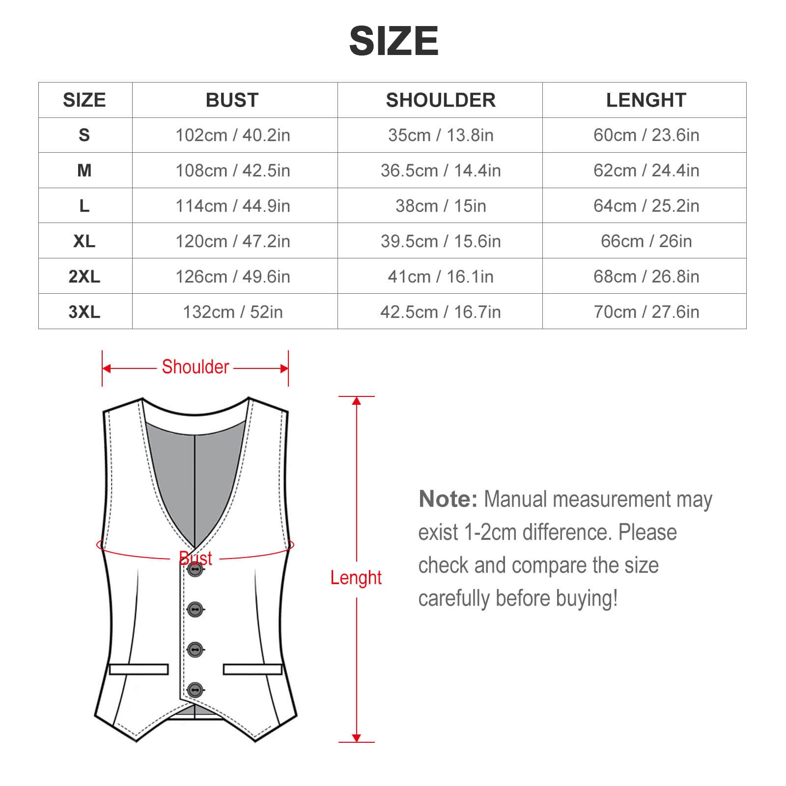 Size | Bust (cm/in) | Shoulder (cm/in) | Length (cm/in) |