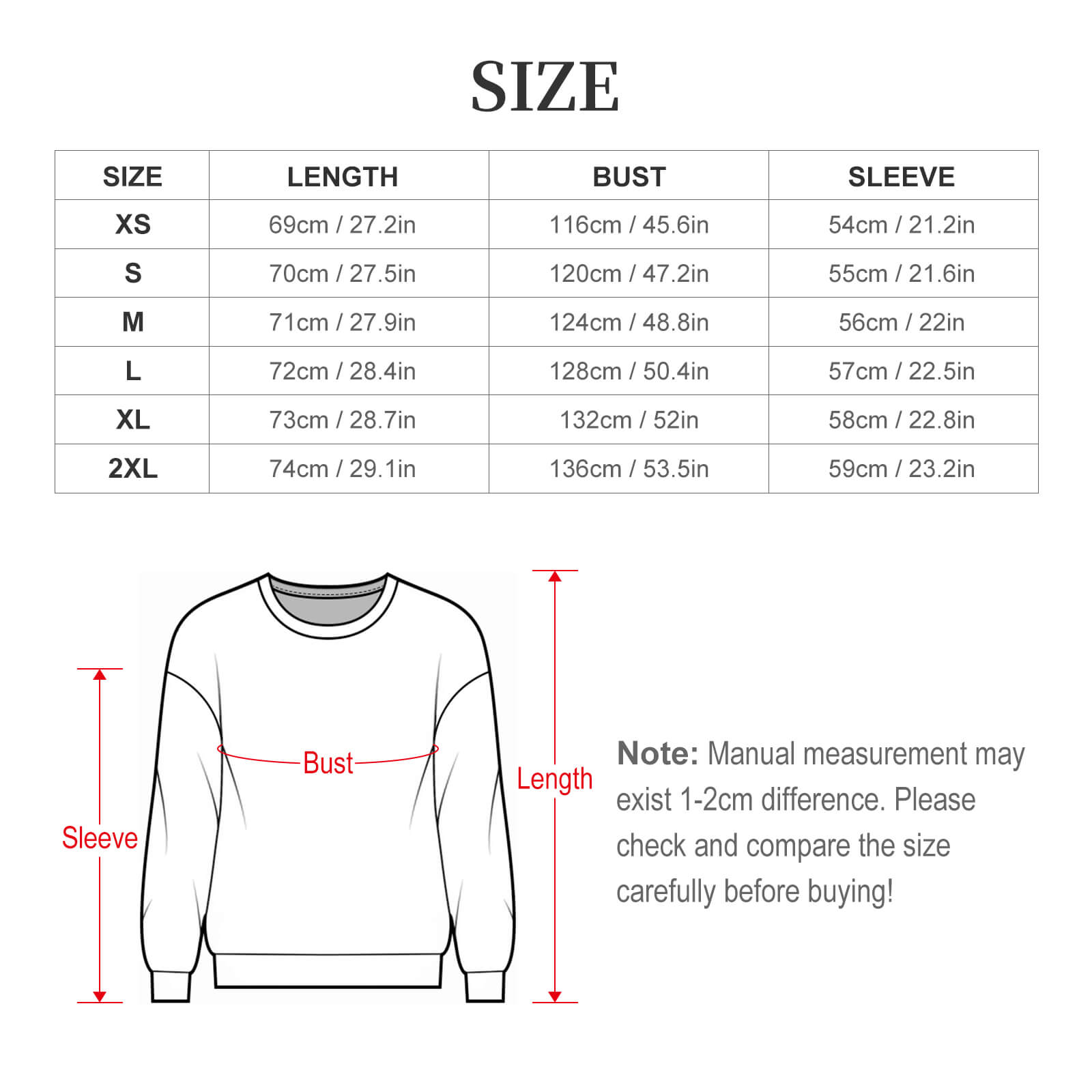 Size | Length (cm/in) | Bust (cm/in) | Sleeve (cm/in) |