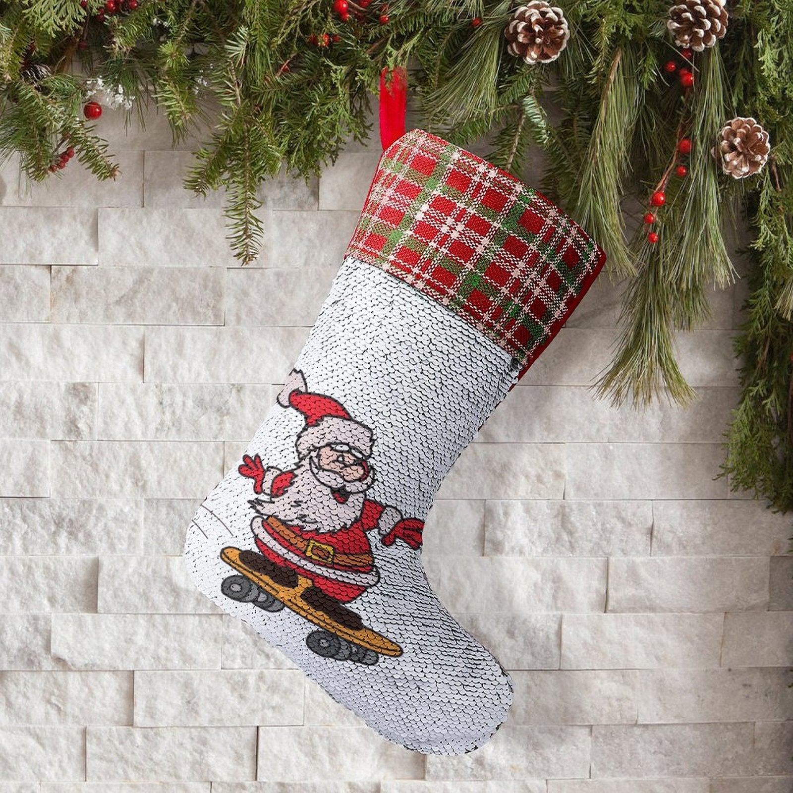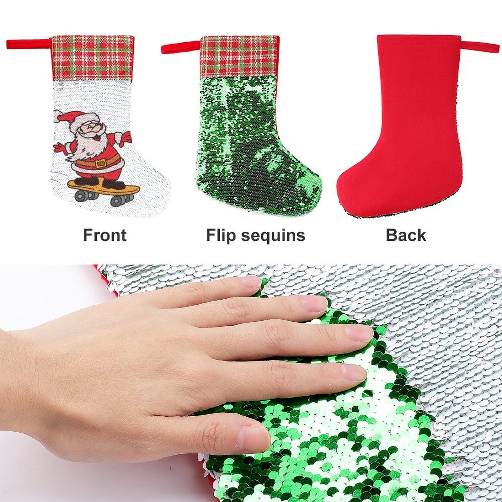 At first glance, it’s a field of shimmering white sequins. But with a gentle brush of the fingers, the sequins flip, revealing a vibrant underlayer of red or green and, with it, your custom-printed image. A child's smiling face, a family name, a festive greeting—it appears as if by magic. This interactive design transforms a classic stocking into an object of wonder and delight, inviting touch and creating a small, joyful moment of discovery.
